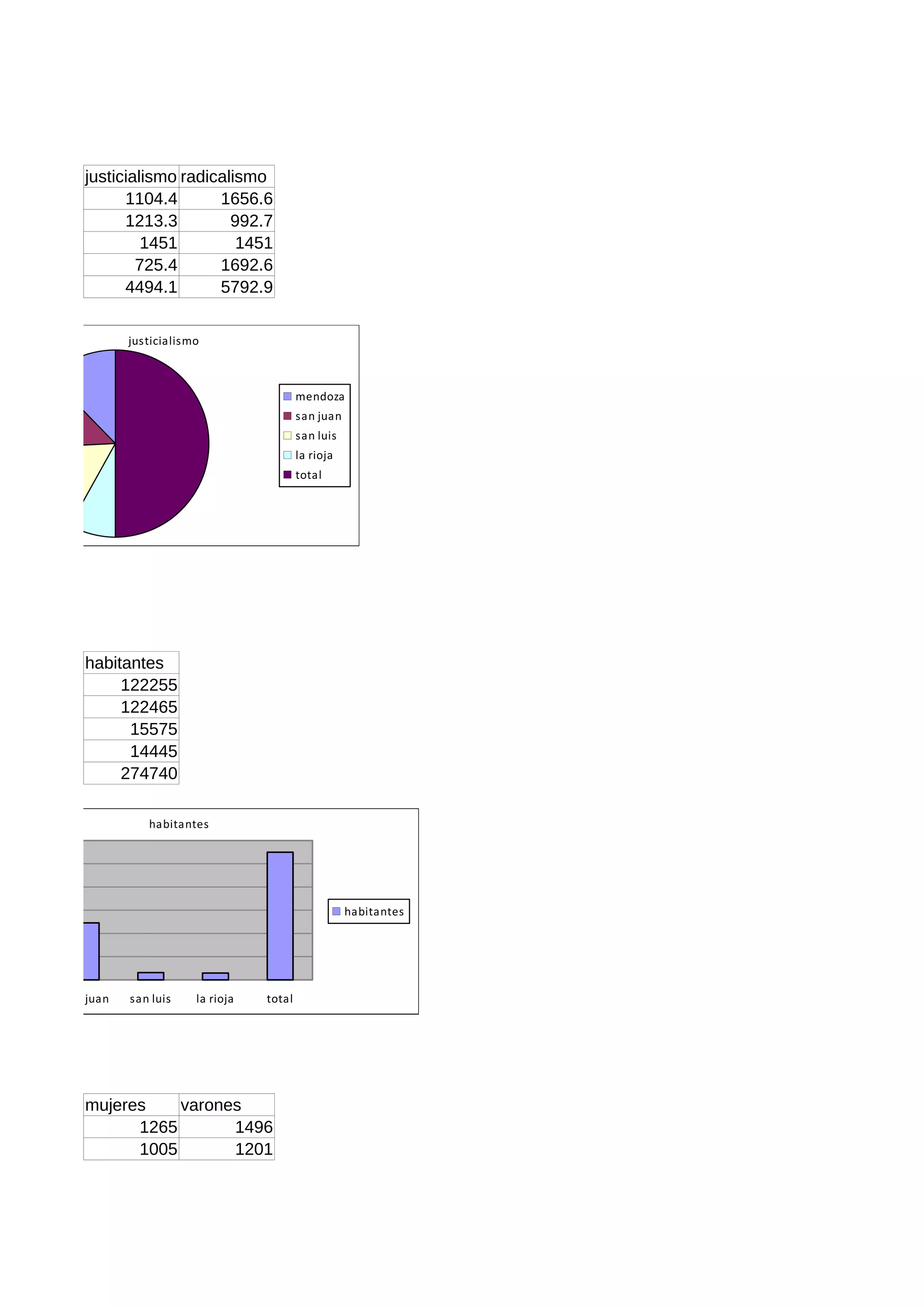 El documento presenta estadísticas demográficas de cuatro provincias de Argentina (Mendoza, San Juan, San Luis y La Rioja). Mendoza tiene la mayor población con 122,255 habitantes, seguida por San Juan con 122,465. En total, las cuatro provincias tienen una población de 274,740 personas. El documento también incluye tablas sobre el número de hombres y mujeres en cada provincia y los gastos diarios durante la semana en diferentes categorías como transporte, comida y ropa.