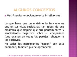 Este documento presenta varios conceptos clave sobre las relaciones de pareja emocionalmente inteligentes. Explica que estos matrimonios han adquirido dinámicas que evitan que los pensamientos y sentimientos negativos sobre la pareja ahoguen a los positivos. También describe los cuatro jinetes que pueden dañar una relación -crítica, desprecio, defensividad y evasión- y técnicas como mejorar la comunicación, cultivar el cariño y resolver problemas de manera constructiva.