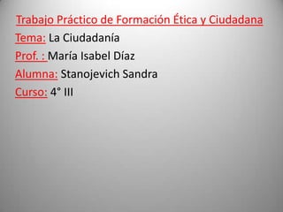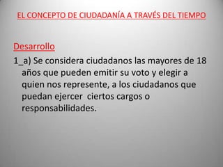 El documento resume el concepto de ciudadanía a través del tiempo. Explica que la ciudadanía implica derechos y obligaciones, y que depende de factores como el cumplimiento de las leyes y la igualdad social. También analiza herramientas de participación ciudadana como el juicio político y la iniciativa popular.
