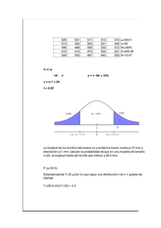 Este documento presenta ejemplos numéricos para calcular percentiles en distribuciones t-Student y F de Snedecor. Explica cómo usar las tablas para encontrar valores críticos correspondientes a diferentes grados de libertad y niveles de probabilidad. También incluye ejemplos de cálculo de probabilidades para variables aleatorias que siguen estas distribuciones.