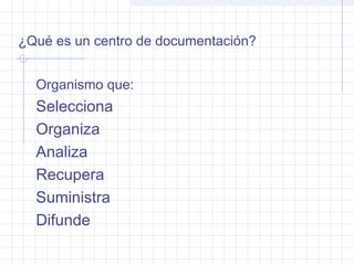 Los centros de documentación son organismos que seleccionan, organizan, analizan, recuperan y difunden información y documentos en un campo temático especializado para satisfacer las necesidades de información de los usuarios. Surgen a mediados del siglo XX como intermediarios entre la información científica cada vez más especializada y abundante, y los usuarios, realizando operaciones documentales como la selección, tratamiento, recuperación y difusión de la información.