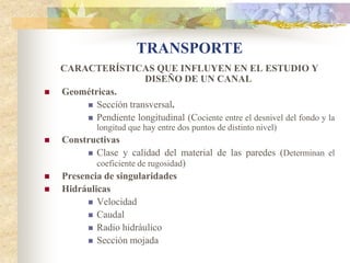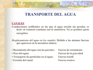 El documento describe los diferentes tipos de transporte de agua a través de canales y tuberías. Explica que en los canales el agua circula sin presión debido a la gravedad, mientras que en las tuberías circula a presión. También describe los diferentes tipos de canales y tuberías, así como las fuerzas y ecuaciones que rigen el movimiento del agua a través de ellos. Finalmente, explica los diferentes tipos de singularidades que pueden afectar el flujo del agua.