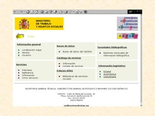 Este documento clasifica los centros de documentación en función de cuatro criterios: ámbito geográfico, nivel de servicios, orientación temática y adscripción institucional. Describe los diferentes tipos de centros que existen dentro de cada categoría, incluyendo sus objetivos y funciones principales.