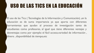 El documento describe el uso de las TIC (tecnologías de la información y comunicación) y las TAC (tecnologías de aprendizaje y conocimiento) en la educación. Explica que las TIC y TAC aportan herramientas útiles para la investigación de estudiantes y profesores y mejoran la comunicación y el acceso a información. También menciona algunas características de las TIC como la instantaneidad, interactividad e interacción. Finalmente, enumera herramientas educativas específicas ofrecidas por las TAC como