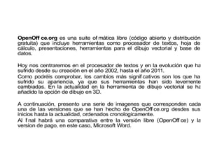 El documento describe la evolución de las versiones de OpenOffice y Microsoft Word, comparando sus ventajas e inconvenientes. OpenOffice es gratis, funciona en todos los sistemas operativos y es fácil de usar, pero carece de algunas herramientas, mientras que Microsoft Word tiene más funciones pero solo es compatible con Windows y requiere pagos y actualizaciones periódicas.