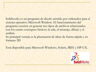 Solidworks es un programa de diseño asistido por ordenador para crear modelos 3D. Permite generar piezas, ensamblajes y planos técnicos. Ha evolucionado desde 1995 añadiendo nuevas funciones como detección de interferencias, configuraciones, superficies y simulación. El Student Design Kit tiene las mismas funciones básicas de interfaz y modelado 3D que la versión completa pero carece de módulos avanzados como análisis y simulación.