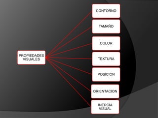 El documento describe las propiedades visuales de las formas, incluyendo el contorno, tamaño, color, textura, posición, orientación, inercia visual y perfil. Explica los perfiles y sólidos básicos como el círculo, triángulo, cubo y esfera. También distingue entre formas regulares e irregulares.