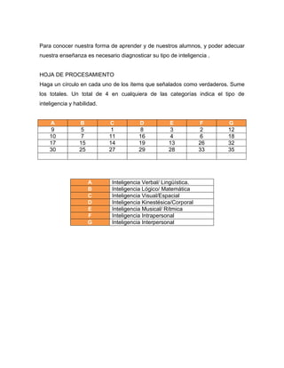 Este documento presenta un test de inteligencias múltiples que evalúa 7 tipos de inteligencia a través de 35 afirmaciones. El participante debe seleccionar las afirmaciones que considere verdaderas y luego sumar el total de cada categoría (A-G). Un total de 4 o más en una categoría indica el tipo de inteligencia dominante de esa persona.