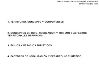 Este documento discute la relación dialéctica entre el turismo y el territorio. Explica que el territorio se define como el espacio adaptado a las necesidades cambiantes de una sociedad a través del proceso de territorialización. Luego describe cómo los componentes del territorio como la sociedad, el medio ambiente y la política económica están interrelacionados y cómo las actividades humanas como el turismo se distribuyen de manera irregular dependiendo de la distribución irregular de los recursos territoriales. Finalmente, analiza conceptos como el ocio, la recreación y el turismo