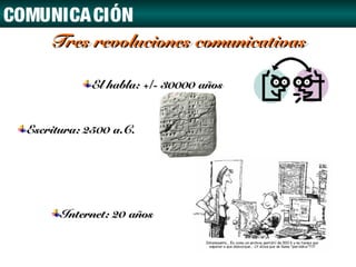 Internet y sus recursos ha experimentado tres revoluciones comunicativas principales: el habla hace aproximadamente 30,000 años, la escritura hace unos 2,500 años, e Internet en los últimos 20 años, que ha transformado radicalmente la forma en que las personas se comunican a nivel global.