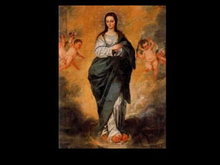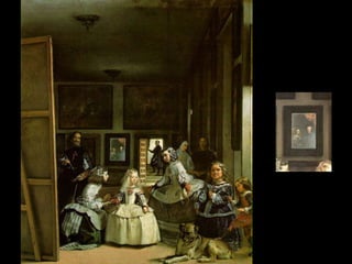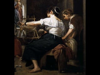 Este documento resume la pintura barroca española durante el Siglo de Oro, destacando a los principales pintores Ribera, Zurbarán, Murillo y Velázquez. Describe el contexto político y social de la época, así como las características de la pintura española como el mecenazgo de la Iglesia y la Corte, el naturalismo en temas religiosos y cortesanos, y el desarrollo de géneros como el bodegón y el paisaje. Explica brevemente las obras y estilos de cada pintor