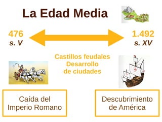 El documento presenta un resumen de la Edad Media en la Península Ibérica. Comienza con la caída del Imperio Romano y la llegada de los visigodos. Luego, en el siglo VIII, los musulmanes invaden la península y establecen Al-Ándalus, mientras que en el norte se forman reinos cristianos. Finalmente, en 1492, los Reyes Católicos conquistan el último reino musulmán de Granada, poniendo fin a la Edad Media en la península.
