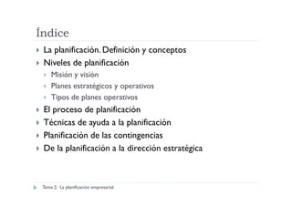 Este documento trata sobre la planificación empresarial. Explica que la planificación es el proceso de establecer objetivos, medios y plazos. Incluye diferentes niveles de planificación como la misión, visión, planes estratégicos y operativos. También describe el proceso de planificación, técnicas de ayuda, y la evolución hacia la dirección estratégica.