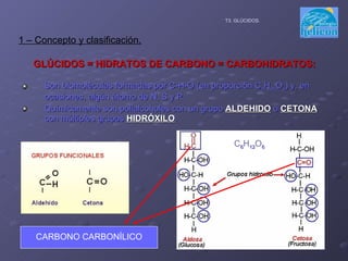 El documento proporciona información sobre los glúcidos o carbohidratos. Explica que están formados por monómeros llamados monosacáridos y que la unión de estos da lugar a disacáridos, oligosacáridos y polisacáridos. Describe las propiedades químicas de los monosacáridos como su carácter reductor y la presencia de isomería, y explica la importancia biológica de estos y sus derivados en el organismo. También define los diferentes tipos de oligo y polisac