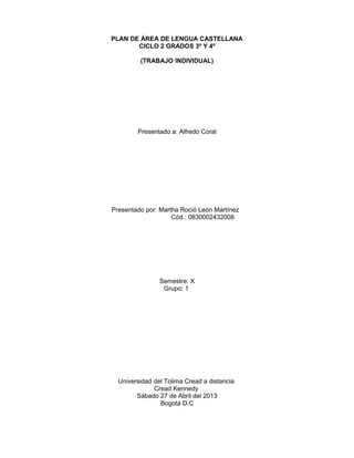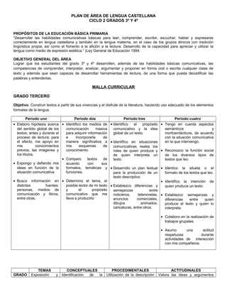 Este documento presenta el plan de área de lengua castellana para los grados 3o y 4o. El plan describe los objetivos generales y específicos del área, así como la malla curricular para cada grado y periodo que incluye temas conceptuales, procedimentales y actitudinales. El plan busca que los estudiantes desarrollen habilidades comunicativas y competencias de comprensión y producción de textos de forma oral y escrita.