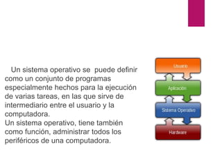 El documento habla sobre los sistemas operativos. Explica que un sistema operativo es un conjunto de programas que permite la ejecución de tareas y sirve de intermediario entre el usuario y la computadora. También administra los periféricos. Los sistemas operativos más conocidos son Windows de Microsoft. Una de sus funciones es cargar y facilitar la ejecución de programas, así como administrar los recursos de la computadora para evitar conflictos.