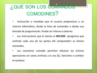 Este documento explica los comandos básicos del intérprete de línea de comandos (cmd) en sistemas operativos Windows. Describe comandos como copy, del, dir y cd que se usan para copiar, borrar y navegar entre archivos y carpetas. También cubre comandos para ver la configuración de red como ipconfig y ping, y explica cómo iniciar el sistema en modo seguro para solucionar problemas.