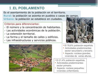 Este documento describe los tipos de poblamiento rural y urbano, así como las características y transformaciones del poblamiento en España. El poblamiento rural puede ser concentrado o disperso, mientras que las ciudades crecen en tamaño y funciones. Las áreas metropolitanas se han consolidado y las ciudades españolas tienen una jerarquía urbana encabezada por Madrid y Barcelona.