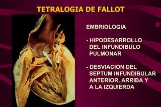 La tetralogía de Fallot es una cardiopatía congénita cianótica causada por el hipodesarrollo del infundíbulo pulmonar. Se caracteriza por comunicación interventricular, estenosis subpulmonar, hipertrofia del ventrículo derecho e hipoplasia del anillo pulmonar. Puede tratarse con cirugía paliativa como fístulas sistémico-pulmonares o con corrección quirúrgica total entre los 6 meses y 2 años de edad para evitar complicaciones.