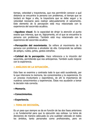 El documento describe la secuencia de actuación en salvamento acuático y la organización necesaria. La secuencia incluye la percepción del problema, análisis de la situación, toma de decisiones, ejecución de acciones y evaluación final. La organización óptima sigue el modelo de la "cadena de salvamento" de Bulgaria, con puestos de salvamento, estaciones de reanimación, traslado a centros sanitarios. Este enfoque aumentó dramáticamente las tasas de supervivencia en Bulgaria.