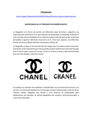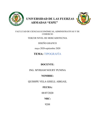 Este documento describe la importancia de la tipografía en el diseño gráfico y ofrece consideraciones para su uso en diseño publicitario. Explica que la tipografía es importante para atraer la atención y generar reacciones en el público, y debe elegirse de acuerdo con la imagen que desea transmitir la empresa. También proporciona recomendaciones como evitar cursivas y mayúsculas, no precipitarse al elegir la fuente, no abusar de fuentes diferentes, considerar la legibilidad y el espacio entre letras.