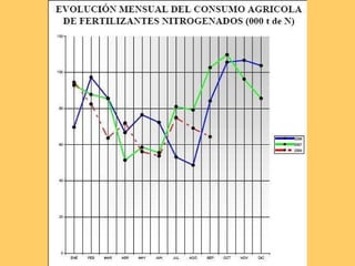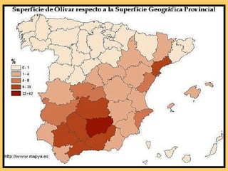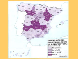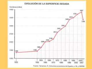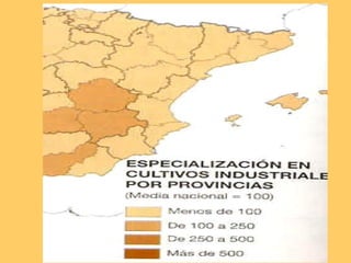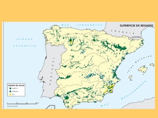 El documento describe los diferentes usos agrícolas del suelo en España. Explica la evolución de la agricultura tradicional a la agricultura actual más mecanizada e intensiva. Detalla los principales cultivos como cereales, vid, olivo, hortalizas y frutales, y su localización. También analiza técnicas como el regadío, invernaderos y nuevos métodos que han permitido aumentar la producción.