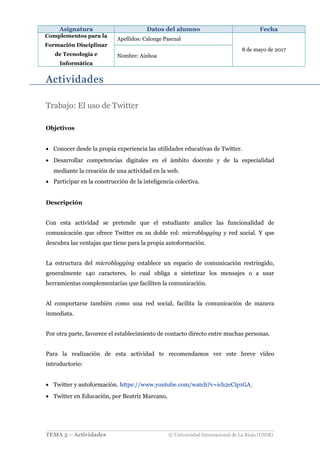 Este documento describe una actividad educativa para estudiantes de 4o de ESO sobre instalaciones domésticas. Los estudiantes trabajarán en equipos para construir una maqueta de vivienda con elementos de domótica que ahorren energía. La actividad se desarrollará en fases utilizando Twitter, con el hashtag #homeautomationtech_4ESO, para compartir información e ideas. En la primera fase, los estudiantes buscarán información sobre domótica energéticamente eficiente. En la segunda, propondrán ideas para los proyectos a través de Twitter