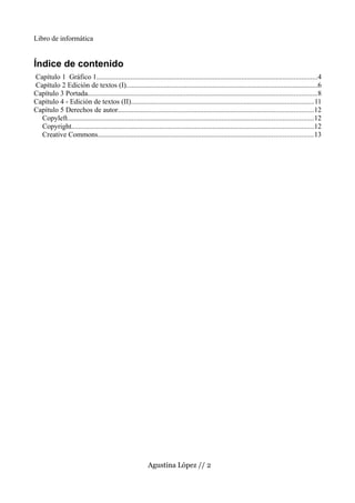 Este documento es un libro de informática dividido en 5 capítulos que cubren temas como edición de imágenes, textos y portadas. Explica cómo hacer capturas de pantalla, recortar imágenes y cambiar su tamaño. También describe cómo modificar formatos de texto y añadir encabezados y pies de página. Por último, define los conceptos de copyleft, copyright y Creative Commons en relación a los derechos de autor.