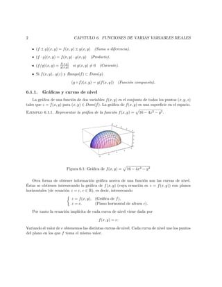 1) El documento trata sobre funciones de varias variables reales, incluyendo su definición, gráficas, curvas de nivel y límites. 2) Explica cómo calcular derivadas parciales de funciones de dos variables respecto a cada variable. 3) Detalla las condiciones para que una función de dos variables sea continua en un punto.