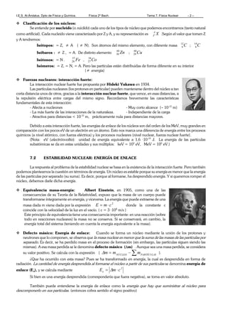 Este documento presenta un resumen de la física nuclear. Explica la estructura del átomo y las partículas subatómicas como protones, neutrones y electrones. También describe las fuerzas nucleares que mantienen unidos los núcleos atómicos, y conceptos como la radiactividad, las leyes de desintegración radiactiva, y los tipos de reacciones nucleares como la fisión y la fusión nuclear. Finalmente, menciona algunas aplicaciones de los procesos nucleares.