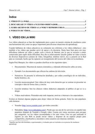 Este documento habla sobre cómo insertar vídeos en una wiki. Explica que se pueden descargar vídeos de sitios como YouTube e insertarlos en la wiki subiéndolos como archivos o usando widgets de vídeo que enlazan al vídeo externamente sin necesidad de subirlo. También proporciona instrucciones detalladas sobre cómo descargar vídeos, subirlos a la wiki, y usar widgets de vídeo para enlazar a vídeos alojados en otros sitios como YouTube.