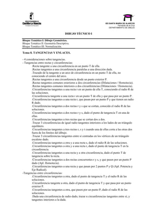 Este documento presenta el tema 8 de Dibujo Técnico I sobre tangencias y enlaces entre líneas y curvas. Explica diferentes tipos de tangencias entre rectas y circunferencias, entre circunferencias, y define los enlaces. Además, incluye ejemplos de actividades y láminas para aplicar estos conceptos al trazado de curvas técnicas y contornos de piezas industriales.