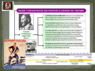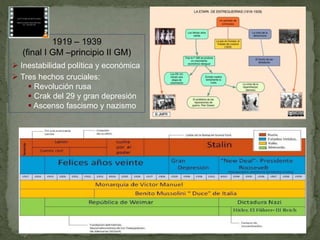 El documento aborda la inestabilidad política y económica en Europa entre las dos guerras mundiales, centrándose en la Revolución Rusa, el ascenso del fascismo y el nazismo, y la crisis de 1929. Describe la transformación de Rusia bajo el régimen bolchevique y la consolidación del estalinismo, así como el impacto de la crisis en Estados Unidos y Europa, que llevó al extremismo político. Finalmente, detalla el ascenso de Hitler al poder, el establecimiento del régimen nazi y sus políticas expansionistas y racistas.