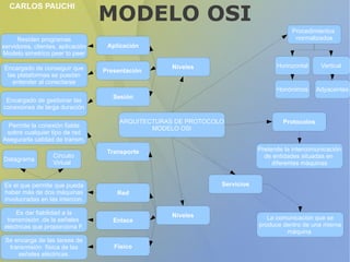 El documento describe el Modelo OSI, que consta de 7 capas que permiten la comunicación entre sistemas de diferentes plataformas. La capa de Aplicación contiene programas clientes y servidores. La capa de Presentación se encarga de gestionar las conexiones de larga duración, mientras que la capa de Sesión permite conexiones fiables sobre cualquier tipo de red. La capa de Red permite más de dos máquinas en las interconexiones y la capa de Enlace proporciona fiabilidad a la transmisión de señales eléctric