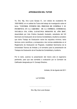 Este documento presenta un resumen de un trabajo de graduación sobre el control interno del proceso de compras y su incidencia en la liquidez de la empresa comercial Yucailla Cía. Ltda. en Latacunga durante el año 2010. El trabajo analiza el control interno del proceso de compras, identifica sus falencias y su impacto en la liquidez de la empresa. Propone el diseño e implementación de un sistema de control interno para mejorar los procesos de compras y la liquidez. El trabajo concluye que un mejor control interno en compras mejoraría la liquide