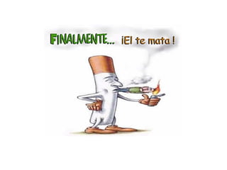 El documento describe los graves efectos del consumo de tabaco en la salud, incluyendo varios tipos de cáncer como pulmón, laringe, labio, boca, lengua, encías, dedos e incluso mama. Explica que el tabaco causa daños en el cuerpo de forma gradual y silenciosa, lo que dificulta la detección temprana del cáncer. Resalta que el tabaco es responsable directo del 92% de los casos de cáncer de pulmón y aumenta significativamente el riesgo de otros tipos de cán