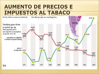 El documento resume las principales ideas sobre la epidemia mundial de tabaquismo y las estrategias efectivas para controlarlo. En particular, destaca que el tabaco se cultiva desde hace 6000 años y su consumo se expandió por el mundo entre los siglos XVI y XVII. Actualmente, el tabaco causa aproximadamente 10 millones de muertes al año y se estima que esta cifra aumentará a menos que se apliquen estrategias como aumentar los impuestos al tabaco, prohibir la publicidad, crear espacios libres de humo y educar a la población.
