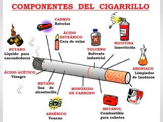 El documento describe los daños que el tabaquismo causa al sistema respiratorio. El humo del cigarro paraliza los cilios respiratorios y permite que 4700 compuestos químicos dañen los pulmones, causando cáncer y otras enfermedades como bronquitis crónica y enfisema. Algunos de estos compuestos también causan arteriosclerosis y elevan el riesgo de enfermedades cardíacas. El tabaquismo detiene la acción de las células inmunes en los pulmones, permitiendo que partí