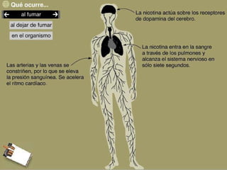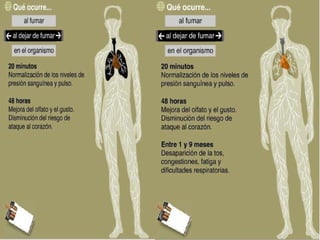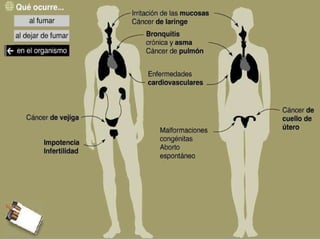 El documento resume la historia del uso del tabaco desde las civilizaciones precolombinas hasta la actualidad, destacando que aunque originalmente se usaba con fines medicinales o rituales, hoy se ha demostrado que es altamente adictivo y la principal causa de muerte evitable. Fuma aproximadamente un tercio de la población mundial y causa millones de muertes cada año, principalmente por cáncer y enfermedades pulmonares.