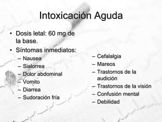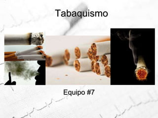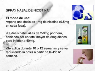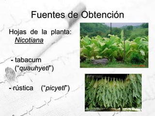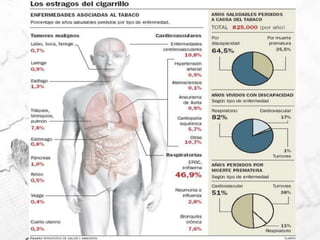 Este documento describe los diferentes tipos y formas de tabaco, así como sus efectos en la salud. Incluye información sobre las hojas de donde se obtienen, los procesos de curación, los aditivos comunes, las presentaciones como pipas, cigarrillos y tabaco para mascar. También cubre la absorción de nicotina, sus efectos en el cuerpo, signos de intoxicación, pruebas de laboratorio, prevención y rehabilitación para dejar de fumar.