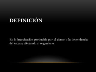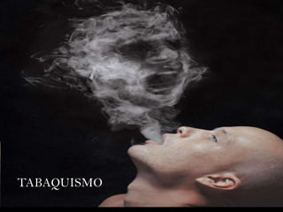 El documento habla sobre los efectos del tabaquismo en la salud. Define el tabaquismo como la intoxicación producida por el abuso o dependencia del tabaco, y describe los componentes del tabaco y la sintomatología de los fumadores habituales. Explica los tipos de fumadores como fumadores activos y pasivos, y los daños a la salud que causa el tabaco como enfermedades crónicas y cáncer en el esófago, pulmón y otros órganos. Finalmente, presenta estadísticas sobre el consumo
