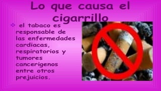 El documento describe los daños del tabaquismo a la salud, señalando que el 50% de los fumadores morirán prematuramente por fumar y que cada 15 minutos muere un argentino a causa del cigarrillo. También detalla que la mayoría de los fumadores comienzan entre los 13 y 16 años, y que organizaciones como la OMS luchan contra el tabaquismo a través de campañas de concientización y prohibiciones de fumar en lugares públicos. Finalmente, presenta algunas de las marcas de cigarrillos más populares en