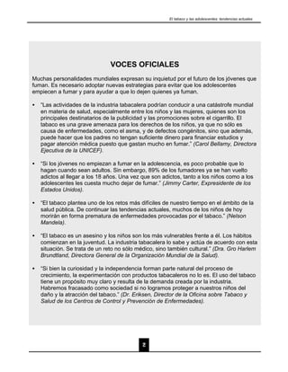 Este documento discute las tendencias actuales del tabaquismo entre adolescentes, especialmente mujeres. Explica que el número de mujeres que comienzan a fumar está aumentando rápidamente, particularmente entre adolescentes y en países en desarrollo. También describe cómo la industria del tabaco utiliza tácticas de marketing agresivas dirigidas a mujeres y niñas para promover el tabaco como un símbolo de independencia y moda. Finalmente, destaca los graves efectos a corto y largo plazo del tabaquismo en la salud de las mujeres, incluido un