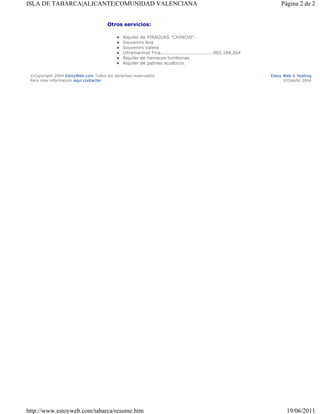 El documento proporciona información sobre alojamientos, restaurantes y otros servicios disponibles en la Isla de Tabarca, incluyendo hoteles como el Casa del Gobernador, hostales como el Hostal Masim y el Hostal El Chiqui, y casas de alquiler. Lista varios restaurantes donde se puede probar la cocina local como el calamar de potera o el arroz de mero. También menciona una taberna y otros servicios como el alquiler de piraguas, souvenirs y hamacas.