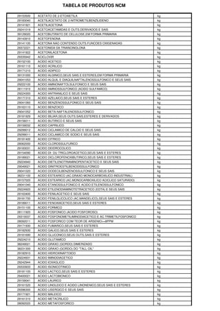 Este documento proporciona una tabla de códigos NCM (Nomenclatura Común del Mercosur) y descripciones de productos. La tabla incluye cientos de entradas con códigos NCM, descripciones de productos como abacá, abacates, abacaxis, abrasivos y ácidos, y unidades de medida. El propósito de la tabla es clasificar una amplia gama de productos de acuerdo con su código armonizado para fines de comercio internacional.