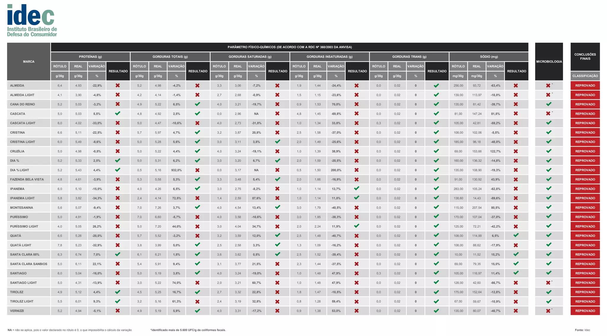 Este documento presenta los resultados de análisis de parámetros físico-químicos y microbiológicos de varias marcas de queijo minas. La mayoría de las muestras analizadas no cumplieron con los límites establecidos para proteínas, grasas totales, grasas saturadas, grasas trans y sodio. Como resultado, la mayoría de las muestras fueron clasificadas como reprobadas.