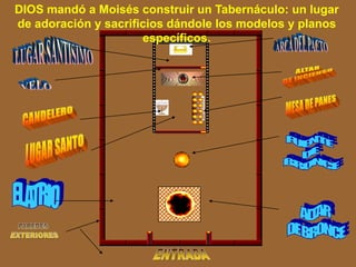 El tabernáculo contenía objetos que apuntaban a Cristo y su obra redentora. Había un altar de bronce para sacrificios, una fuente de bronce para limpieza, y un lugar santo con candelabros, mesa de panes y altar de incienso. Lo más sagrado era el lugar muy santo con el arca del pacto cubierta por querubines, que albergaba la presencia de Dios. Todo esto enseñaba que, a través de la muerte de Cristo, ahora podemos acercarnos a Dios con confianza.