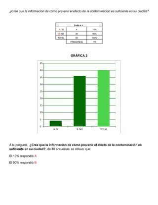 El documento presenta los resultados de una encuesta sobre contaminación ambiental y conciencia ecológica realizada a 40 personas. La mayoría de los encuestados (93%) considera que la contaminación ambiental es un problema actual, pero la mayoría (90%) también cree que la información para prevenirla es insuficiente. Todos apoyan la limpieza en sus hogares y casi todos (98%) creen que el manejo de desechos contribuye a la preservación ambiental. Sobre el enfoque CTS, el 70% respondió una opción y el 30% otra.