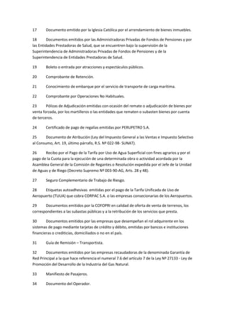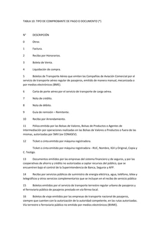 Este documento presenta una tabla con 38 tipos diferentes de comprobantes de pago o documentos, identificados con un número y breve descripción. Entre los tipos de documentos se incluyen facturas, boletas de venta, recibos por honorarios, liquidaciones de compra, boletos de transporte aéreo y terrestre, pólizas de seguros, conocimientos de embarque, recibos de servicios públicos y más. La tabla provee una clasificación estandarizada de documentos comerciales para fines tributarios.