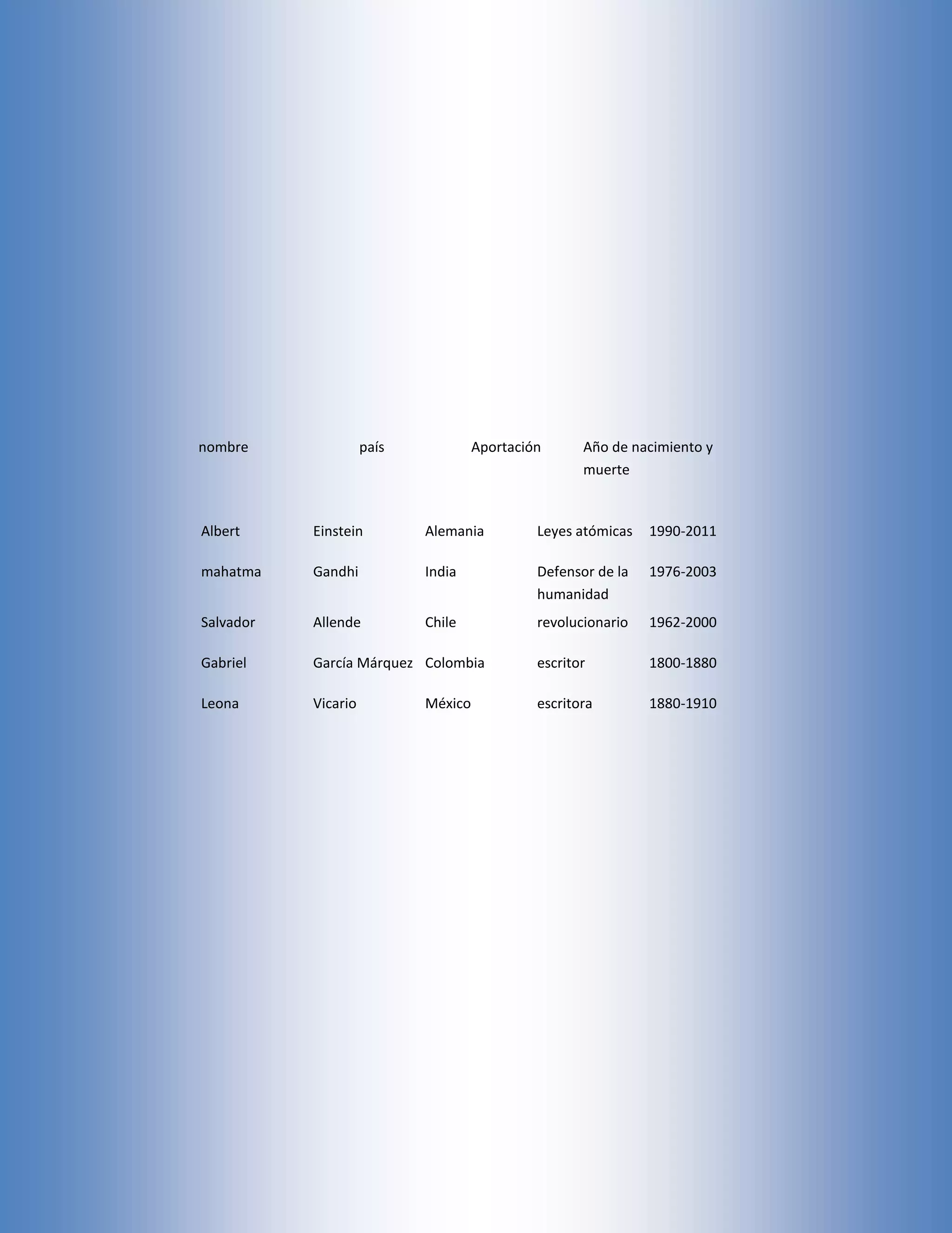 Este documento lista 5 personas históricas, sus nombres, países de origen, sus principales contribuciones y años de nacimiento y muerte. Incluye al físico Albert Einstein, el líder pacifista Mahatma Gandhi, el presidente revolucionario Salvador Allende, el escritor Gabriel García Márquez y la escritora y heroína mexicana Leona Vicario.